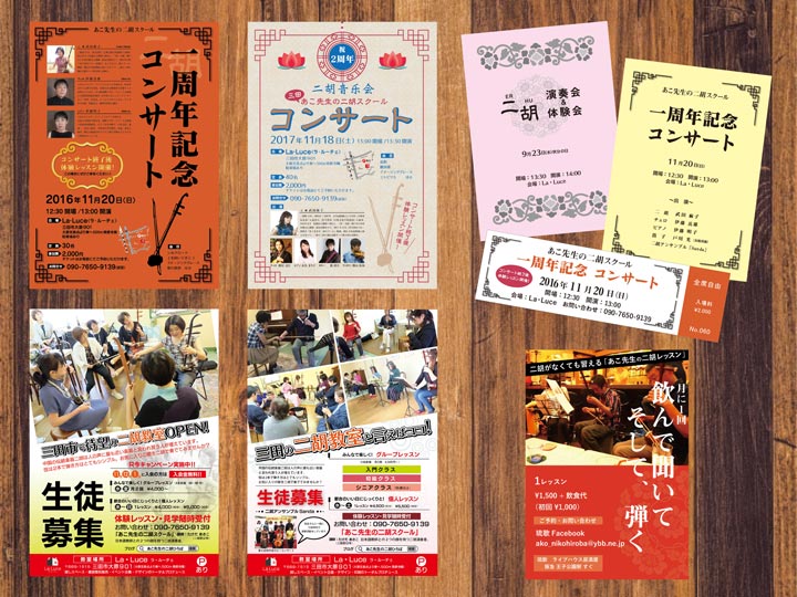 集客用のチラシは目に留めていただくことを意識し、イベント用のチラシは中国の代表的な民族楽器ということもあり、中国風装飾をポイントに取り入れて制作しました。
