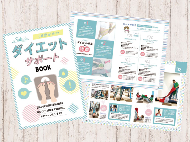 シェイプアップを目指す50代の方向けのトレーニングスタジオの紹介兼テキストの制作。ゆるめのイラストと写真の多用、ポップな配色で楽しく学べる雰囲気に。ダイエットの成功例でより親近感を感じさせるような構成にしました。
